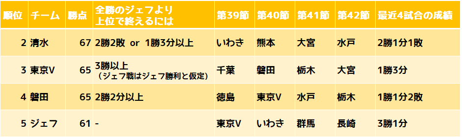 東京Vは今週末ジェフとの直接対決があるため、そこはジェフが勝つことで仮定すると、次節終了時点で東京Vは勝点65、ジェフは勝点64となる。